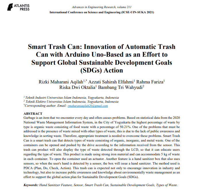 Smart Trash Can: Innovation of Automatic Trash Can with Arduino Uno-Based as an Effort to Support Global Sustainable Development Goals (SDGs) Action